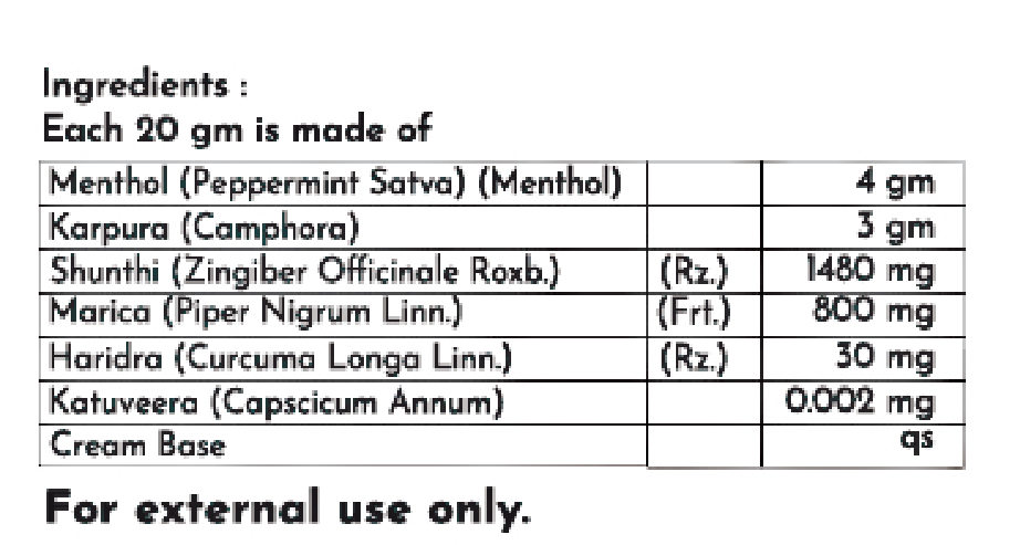 Ayurvedic proprietary pain relief cream formulated with menthol, camphor, ginger, black pepper, turmeric, and capsicum for soothing external application.